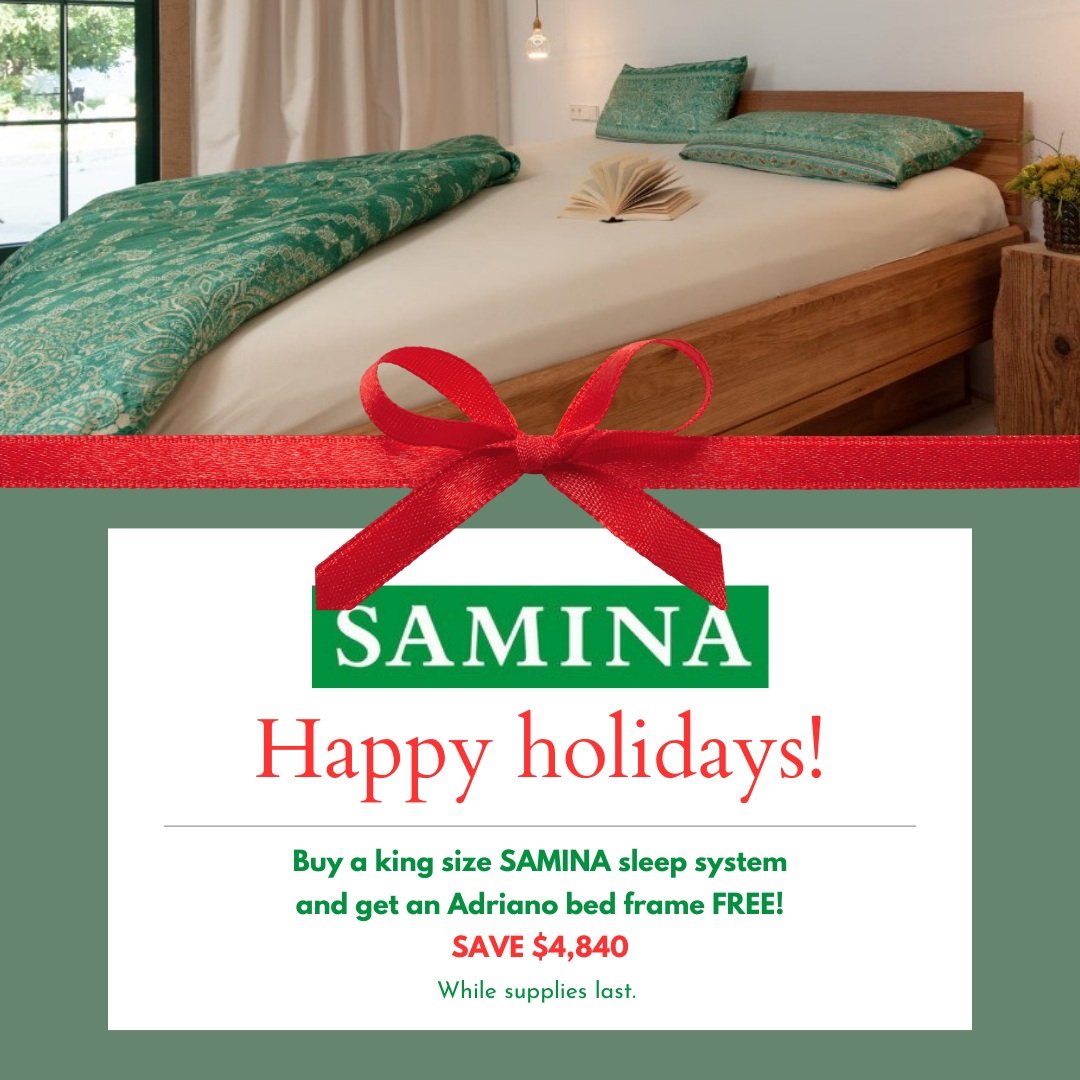 - FREE Adriano King Bed Frame ($4,840) with purchase of New SAMINA Sleep System