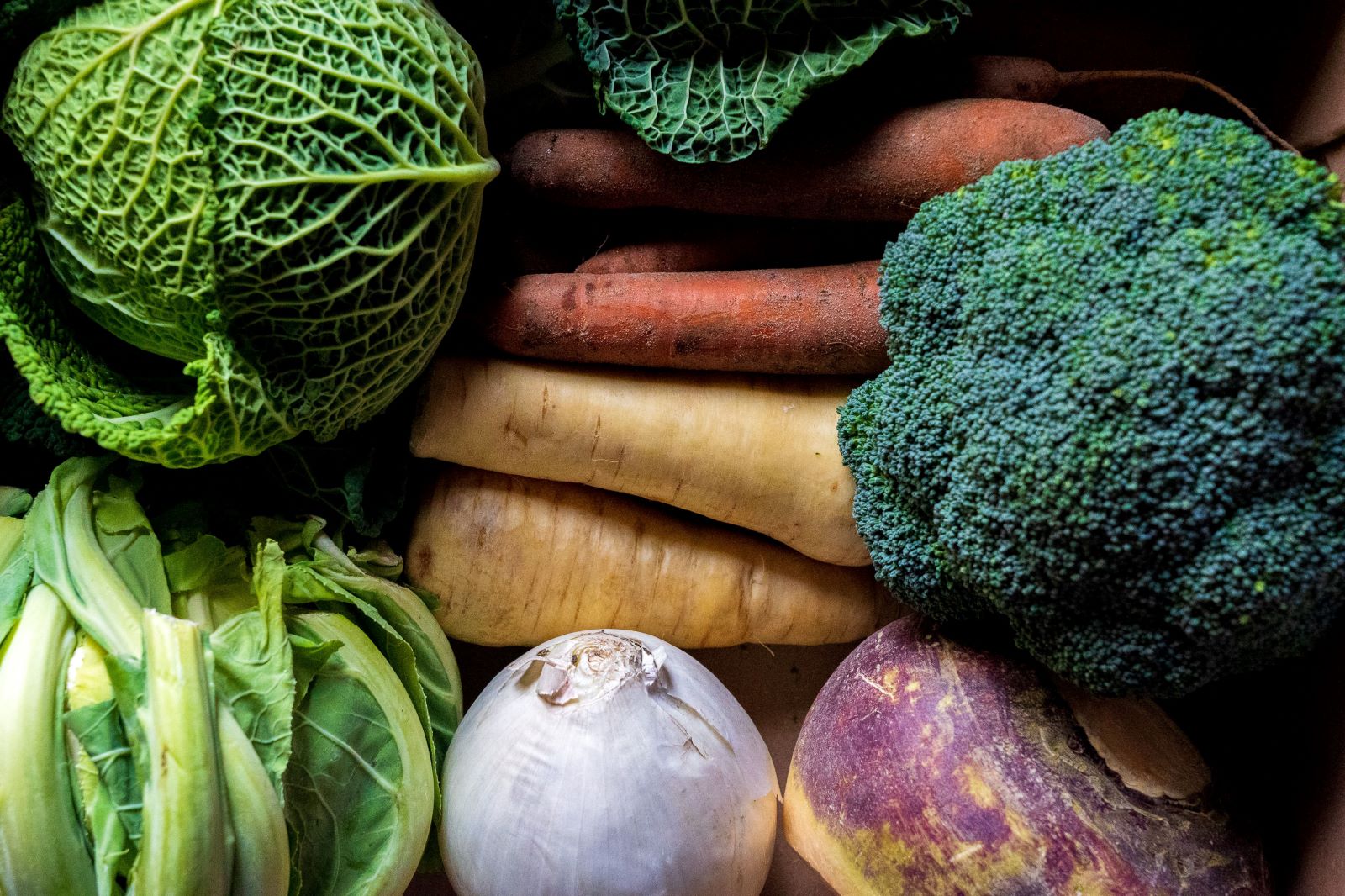 a close up shot of several different vegetables, like a white onion, three carrots, a head of broccoli, and kale.